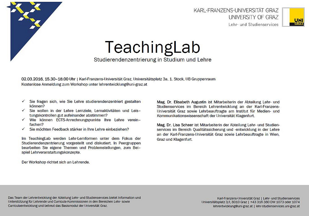 Im TeachingLab werden Lehr-Lernformen unter dem Fokus der Studierendenzentrierung vorgestellt und diskutiert. In Peergruppen bearbeiten Sie eigene Themen und Problemstellungen, zum Beispiel Lehrveranstaltungskonzepte. Der Workshop richtet sich an Lehrende.